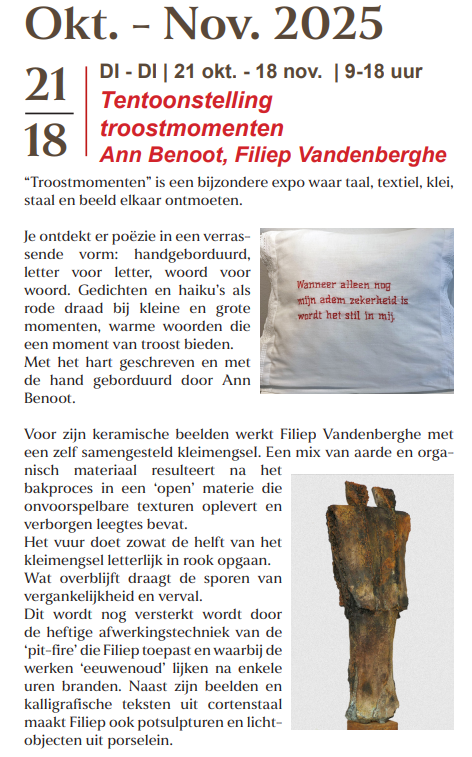 “Troostmomenten” is een bijzondere expo waar taal, textiel, klei, staal en beeld elkaar ontmoeten.