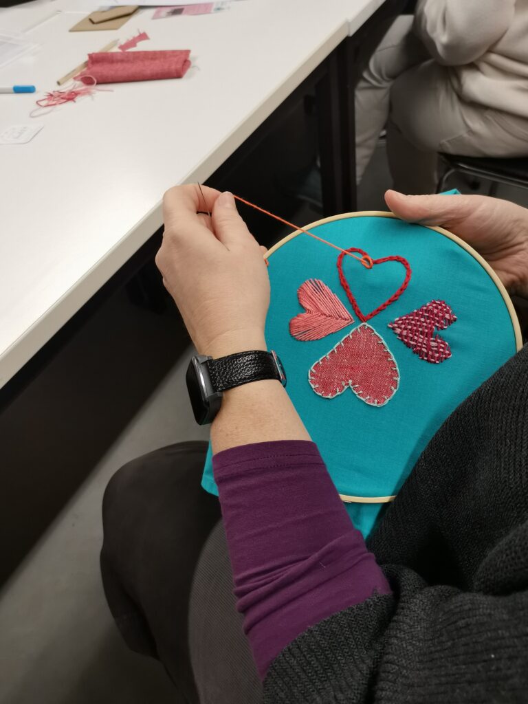 “Borduren is één van die activiteiten waarbij je helemaal in het moment kan duiken. Samen ontdekken we de kleurrijke veelzijdigheid van een aantal eenvoudige borduursteken waarmee je eindeloos kan variëren. Niet de perfectie telt, wel de liefde waarmee je jezelf toelaat om creatief aan de slag te gaan en steek voor steek jouw unieke collectie hartjes vormgeeft met naald en draad. Of je nu kiest voor het borduren van afzonderlijke lapjes die je later als een kleurrijk patchwork samenvoegt, of alle hartjes als een kunstzinnige collage op één stuk stof laat schitteren, de mogelijkheden zijn eindeloos.